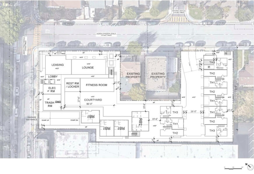• The proposed project is a multi-family residential development consisting of 64 apartment units and 11 townhome units resulting in a total of 75 units, all of which would be for-rent.• The 64-unit apartment building is approximately 55’-10” in height (five stories) and is located along the northern half of the site with frontage along both Monte Diablo Avenue and N. Kingston Street.• The apartment building consists of one level of below-grade parking accessed along Monte Diablo Avenue with 45 parking spaces.• The 11 townhome units are split into two main buildings approximately 31’-6” in height (three stories) and are located toward the southern half of the site with frontage along N. Kingston Street. Each townhome unit would consist of an at-grade, private one or two-car garage accessed through a shared driveway that connects with N. Kingston Street.